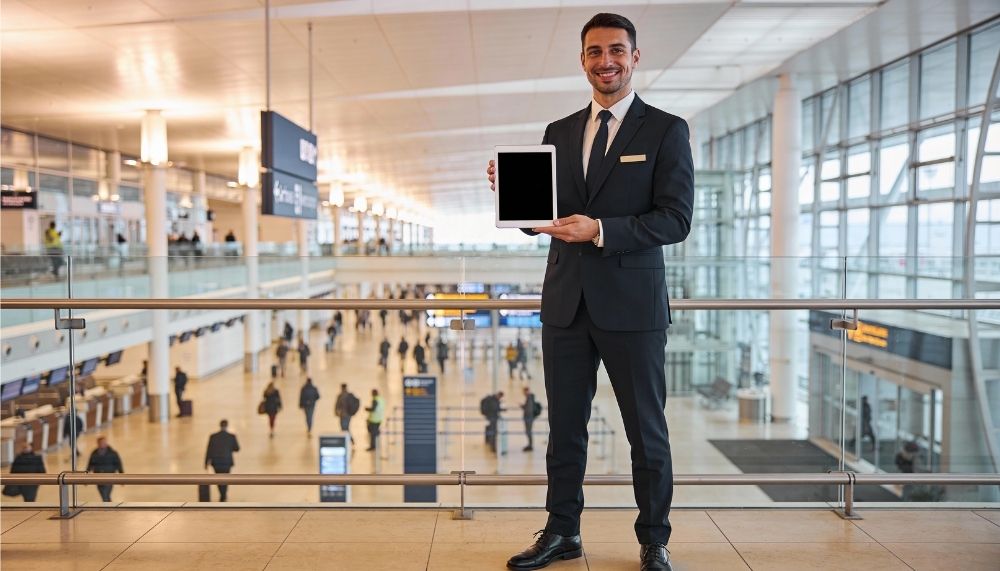 Habitués aux prises en charge aéroportuaires, nos chauffeurs suivent l’arrivée de votre vol en temps réel et s’adaptent à tout retard ou avance. À votre sortie du hall des arrivées, vous identifiez immédiatement votre chauffeur, muni d’une tablette nominative, prêt à vous accompagner.